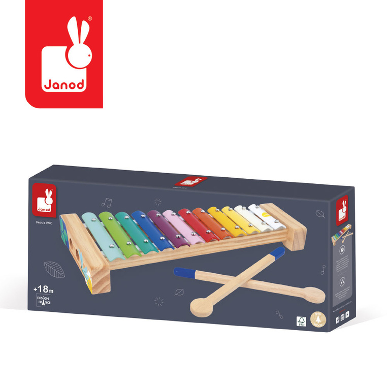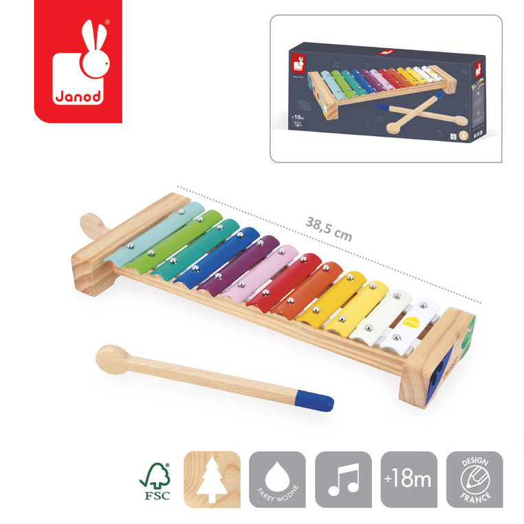 Drewniane cymbałki z serii Gioia francuskiej marki JANOD to idealna pierwsza zabawka muzyczna dla dziecka, która pomaga rozwijać słuch, poczucie rytmu oraz zdolności muzyczne. Wspiera także rozwój wyobraźni, koncentracji, wytrwałości i koordynacji ruchowej. Ksylofon ma poręczny rozmiar, 12 klawiszy i tęczową kolorystykę. Do kompletu dołączona jest para drewnianych pałeczek. Zabawka zaprojektowana we Francji. Idealnie nadaje się na prezent.