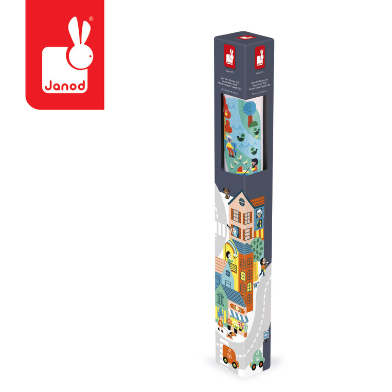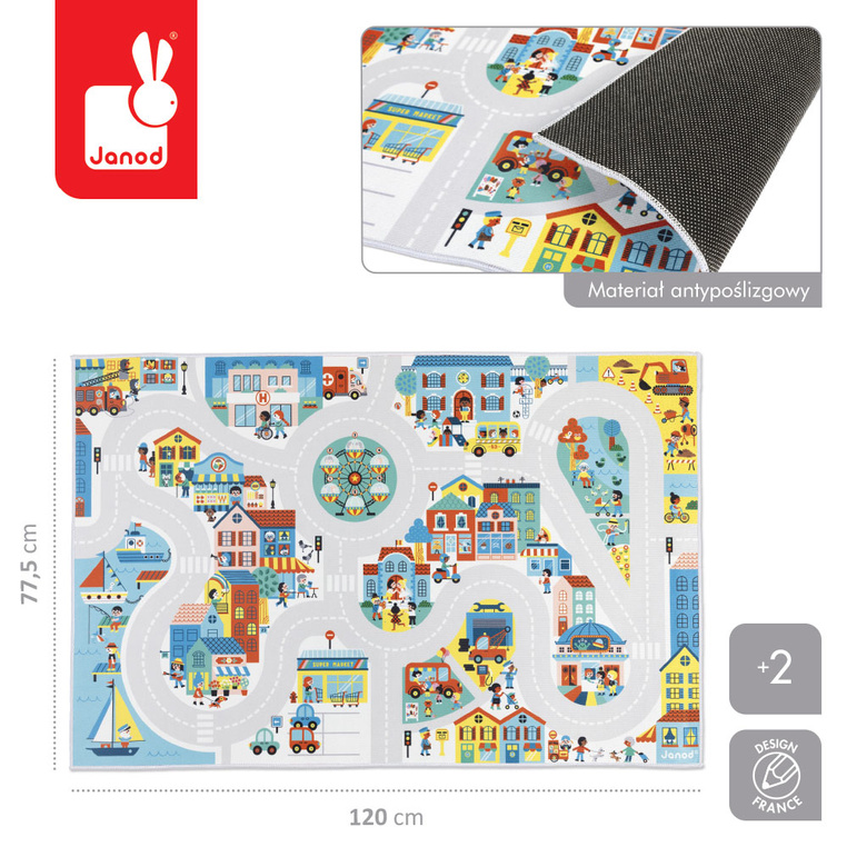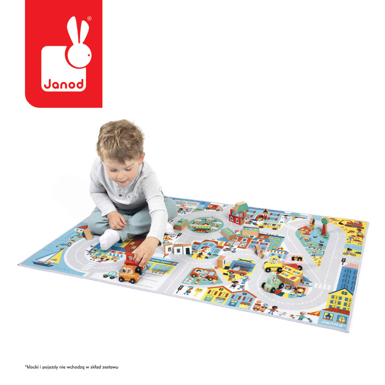 Mata-dywan do zabawy z drogą Miasto z kolekcji Cross Roads francuskiej marki JANOD to idealny prezent dla dzieci już od 2. roku życia. Ma spore rozmiary 120 x 77,5 cm, jest przyjemna w dotyku oraz pozostaje na swoim miejscu, dzięki antypoślizgowej warstwie spodniej. Mata przedstawia bogate w szczegóły miasto, w którym dziecko może za każdym razem odkrywać coś nowego. Znajdzie w nim różne postacie oraz charakterystyczne dla miasta miejsca m.in. plac budowy, marinę czy szpital, a wszystkie punkty łączy sieć dróg. Na miejskiej macie mali odkrywcy mogą bawić się, jednocześnie ucząc się o zawodach, liczbach i warzywach.