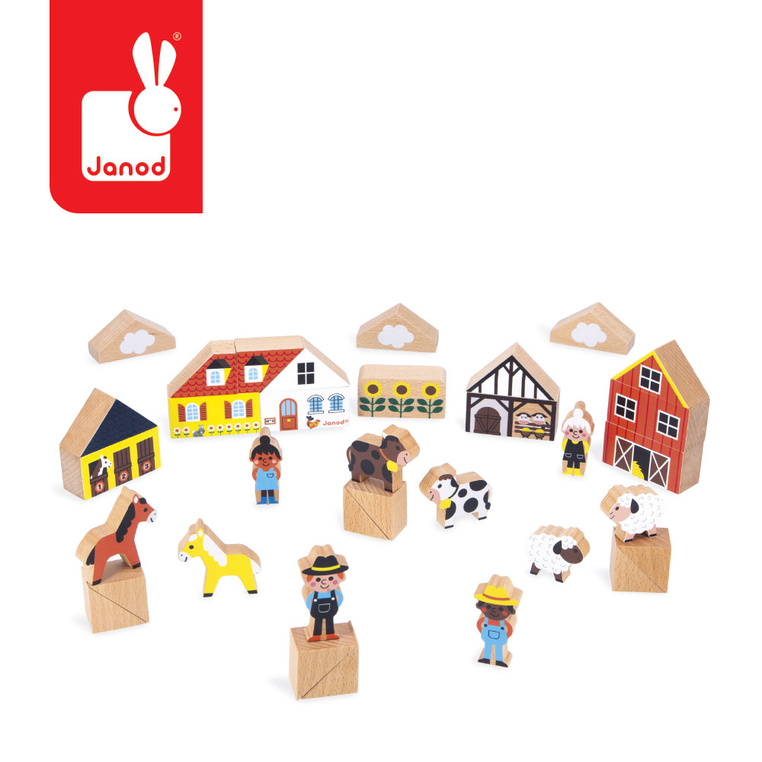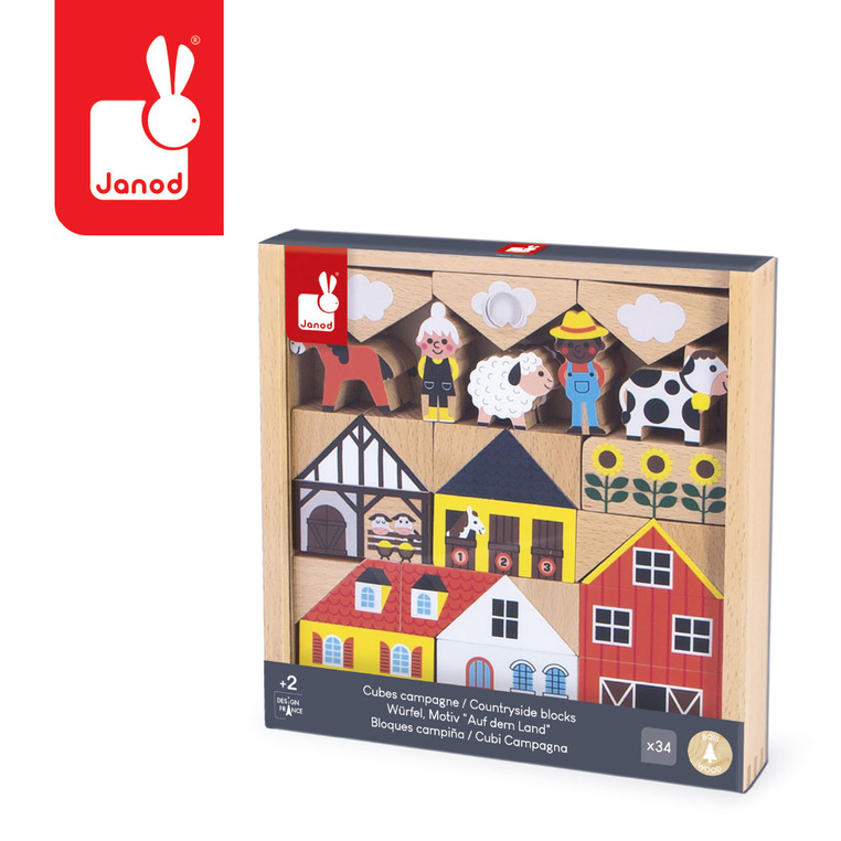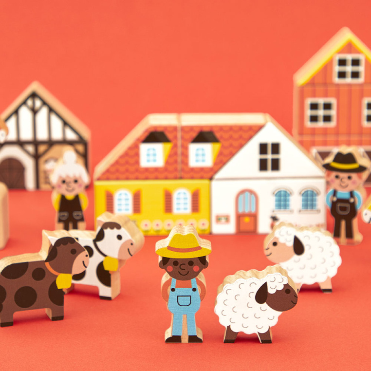 Zestaw klocków i figurek z serii Cross Roads francuskiej marki JANOD to doskonałe uzupełnienie maty-dywanu do zabawy z drogą Wieś z tej samej kolekcji. W jego skład wchodzi: