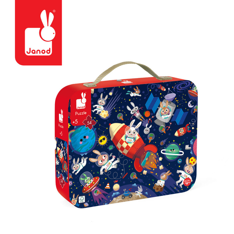 Zestaw puzzli w walizce Rakieta kosmiczna francuskiej marki JANOD składa się z 54 elementów, po ułożeniu tworzących piękny, bogaty w szczegóły obrazek, przedstawiający przestrzeń kosmiczną, pełną pojazdów kosmicznych (rakiet, sond i statków UFO) oraz astronautów-królików. Gotowa ilustracja ma wymiary 50 x 40 cm.